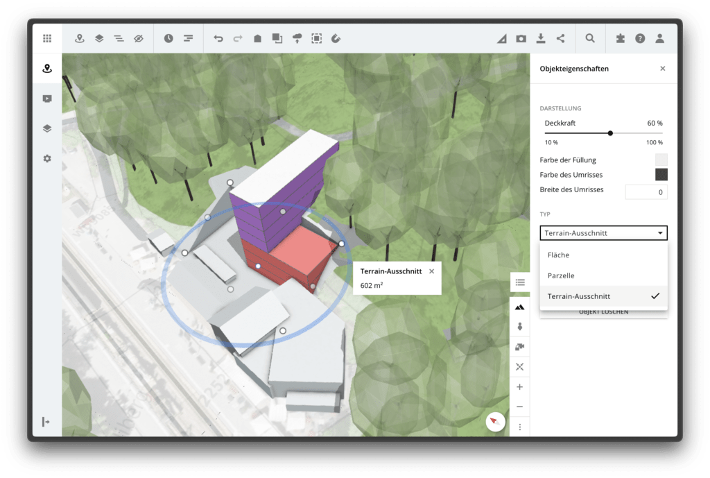 Sind Teile des importierten Modells verdeckt oder das Terrain stark verändert worden? Kein Problem mehr: Flächen und importierte Parzellen aus dem Kataster können jetzt direkt in einen Terrain-Ausschnitt konvertiert werden und umgekehrt. In den Objekteigenschaften einer Fläche oder Parzelle kann dazu zwischen den Typen Fläche, Parzelle und Terrain-Ausschnitt gewechselt werden.