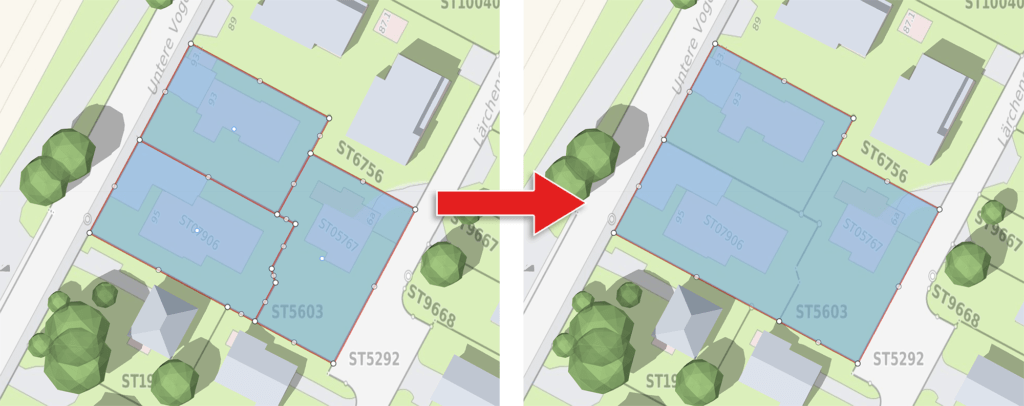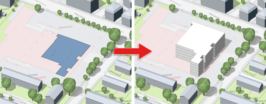 Gebäude kannst du nun auch direkt aus einer Fläche erstellen. Markiere die Fläche und klicke in den Objekteigenschaften rechts zuunterst auf den Button «In Gebäude umwandeln». Dabei kannst du wählen wie viele Geschosse erstellt werden sollen, wie hoch die Geschosse sein sollen und ob die Fläche entfernt werden soll.
