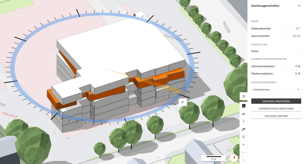 Die neuen Konstruktionswerkzeuge sind da! Erstelle Volumen flexibler und individueller. Mit den neuen Werkzeugen kannst du einzelne Stockwerke selektieren und bearbeiten. Markiere mehrere Stockwerke mit gedrückter Shift-Taste und erstelle Balkone und andere Features auf einfachste Weise. Mit der Alt-Taste kannst du neue Kanten in allen markierten Stockwerken einfügen oder entfernen. Auch die Geschosshöhe, Farbe oder Rotation kann per Stockwerk eingestellt werden. Gebäude stapeln ist immer noch möglich.