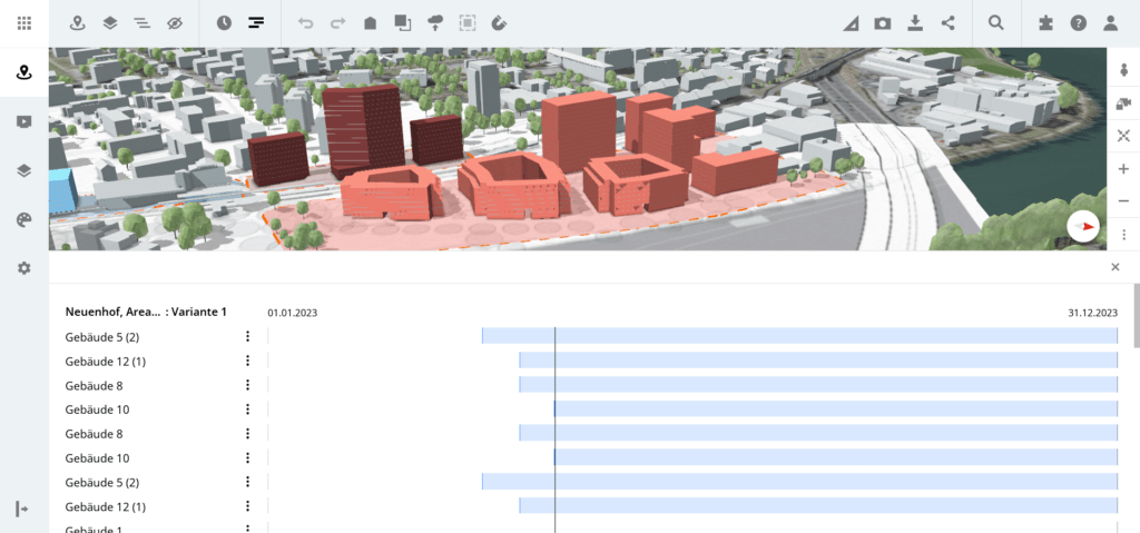 Findet dein Projekt über verschiedenen Phasen statt? Mit der Projektzeitleiste lässt sich dies leicht visualisieren. Definiere pro Objekt in deinem Projekt eine zeitliche Gültigkeit. Mit dem Verschieben der Zeitleiste können dann die einzelnen Etappen eines Projekts abgespielt werden. Die Projektzeitleiste kann als App aus dem Marktplatz installiert werden.
